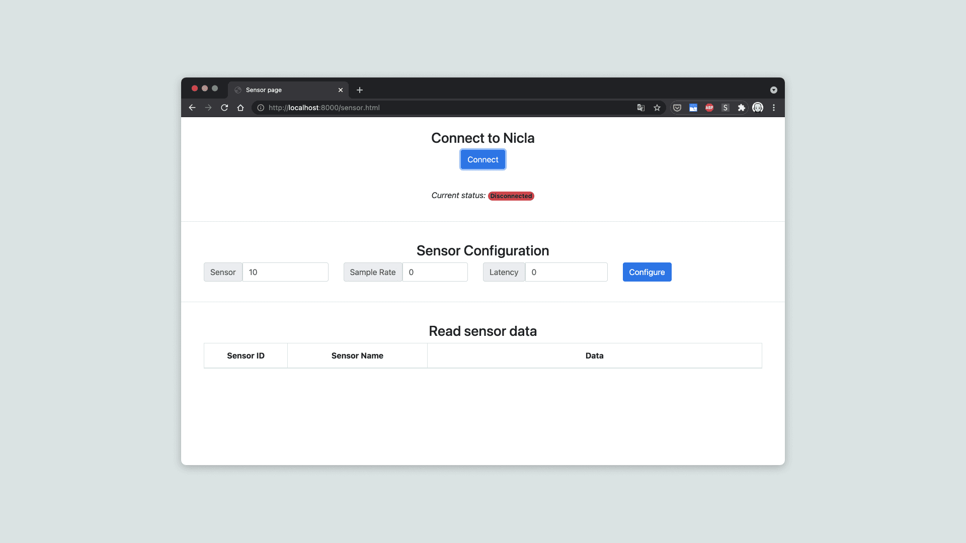 When the server has started, you can open the landing page in your browser: http://localhost:8000/. Click on "Open sensor page". Then click the "Connect" button and pair your computer with the Nicla Sense ME board.