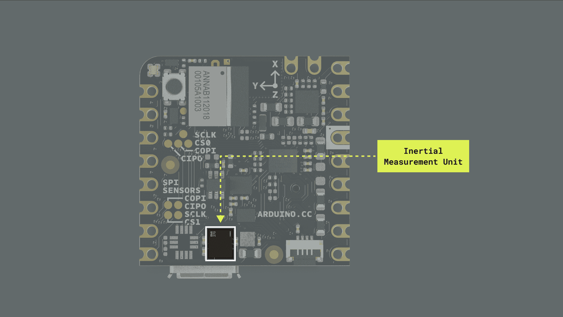 • Onboard advanced motion sensors: the board features the BMI270, a high-precision Inertial Measurement Unit (IMU) from Bosch® Sensortec, which combines a 3-axis accelerometer and a 3-axis gyroscope for precise motion tracking and orientation detection. The board also features the BMM150, a compact geomagnetic sensor from Bosch® Sensortec with a 3-axis magnetometer.