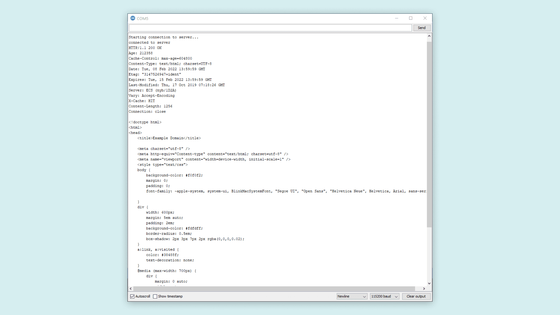as default. Feel free to change this and take a look at how it prints different webpages. Below you can see what will be printed in the Serial Monitor when connecting to example.com