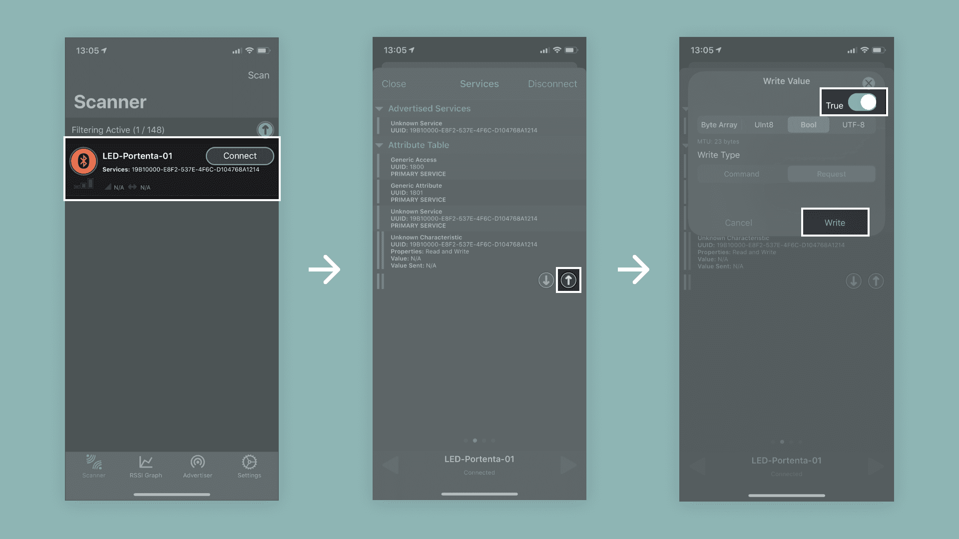 • Switch to "Bool" type and move the toggle to "True". Confirm the dialog with a tap on "Write" and you should see the built-in LED turned on. If you do the same procedure again but setting the toggle switch to "False", it will turn off the LED.