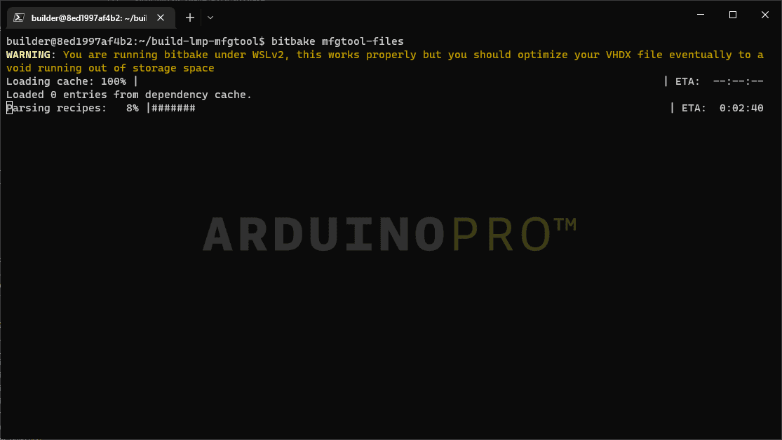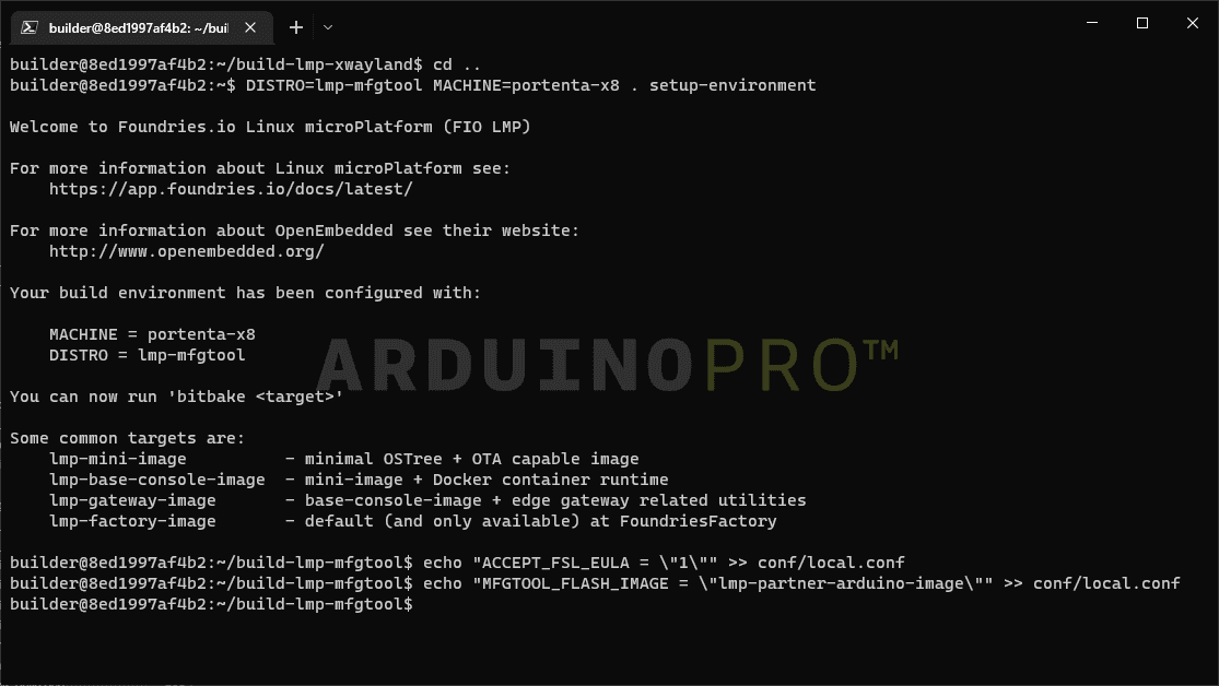 following the command sequence:1cd ..2DISTRO=lmp-mfgtool MACHINE=portenta-x8 . setup-environment3echo "ACCEPT_FSL_EULA = \"1\"" >> conf/local.conf4echo "MFGTOOL_FLASH_IMAGE = \"lmp-partner-arduino-image\"" >> conf/local.conf