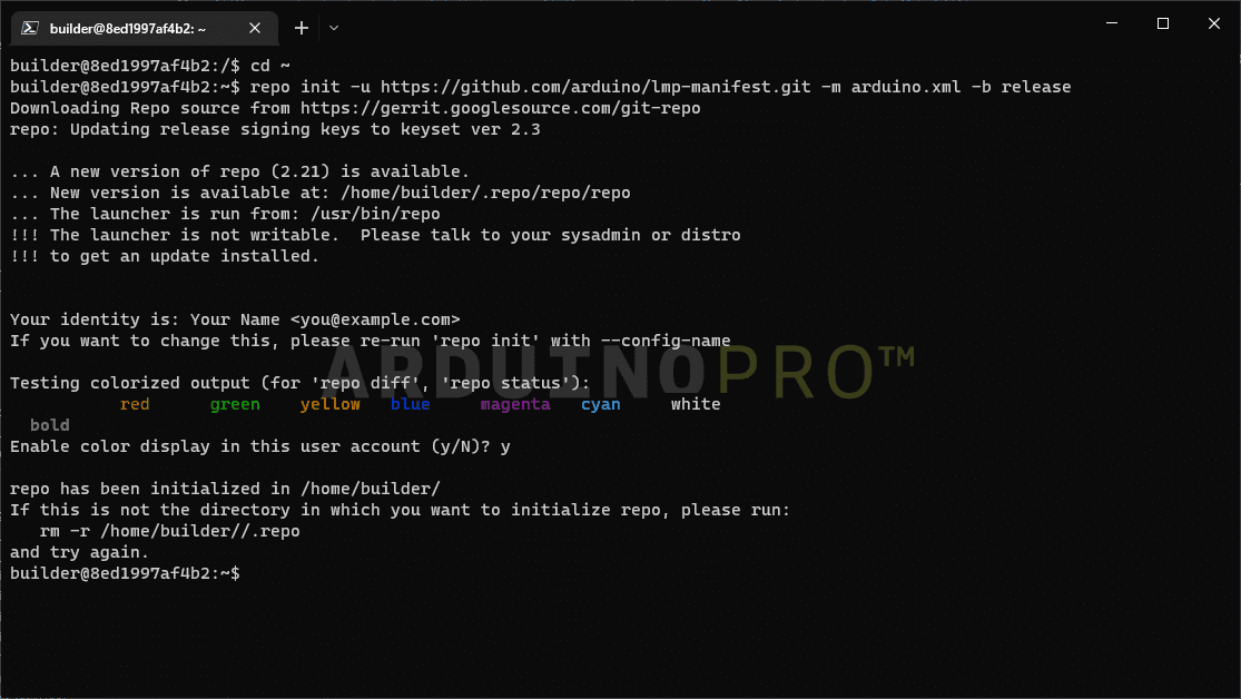 1cd /dockerVolume2repo init -u https://github.com/arduino/lmp-manifest.git -m arduino.xml -b release