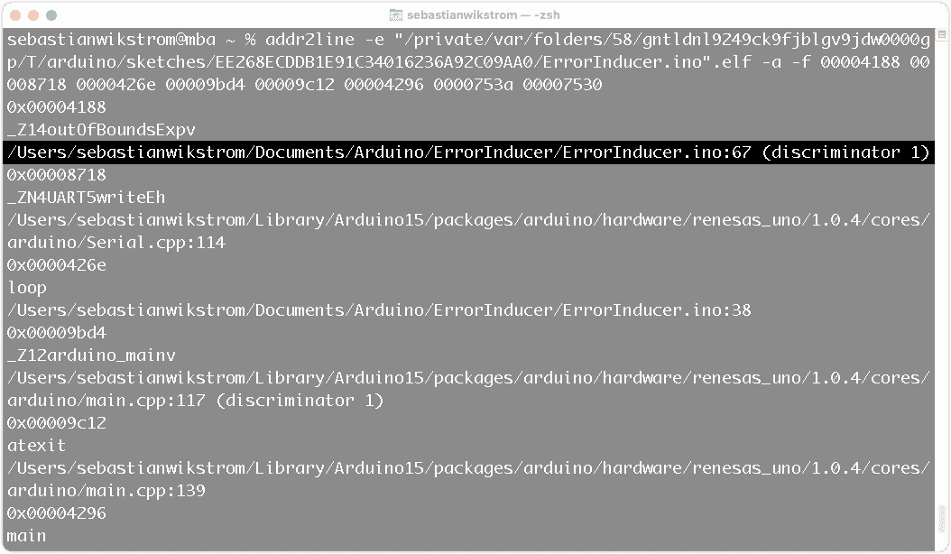 utility is included in the Arduino UNO R4 Boards boards package. However, running it in this way requires modifying the command included in the output. For convenience, you may want to install addr2line